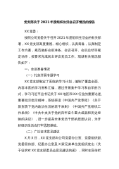 党支部关于2021年度组织生活会召开情况的报告XX党委:按照公司党委关于召开2021年度组织生活会的有关部署,XX党支部高度重视,精心组织,认真筹备,认真制定工作方案,规范做好会前准备、会议召开、会后总结等规定动作,按要求完成民主评议党员工作。现就有关情况报告如下:一、会议准备情况(一)扎实开展专题学习XX党支部制定了系统的学习计划,编制了覆盖全面、内容丰富的学习资料汇编,通过开展集中学习和自学的方式,学习习近平总书记关于XX地区和XX行业的重要论述、重要批示指示精神,系统研读《中国共产党章程》《关于新形势下党内政治生活的若干准则》《中国共产党组织工作条例》《中共中央关于党的百年奋斗重大成就和...