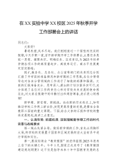 在XX实验中学XX校区2025年秋季开学工作部署会上的讲话同志们:大家好!暑退秋澄,风禾尽起。我们刚刚度过一个紧张而充实的假期,今天齐聚一堂,召开新学期开学工作部署会,主要任务是统一思想、凝聚共识、明确任务、压实责任,为2025年秋季学期各项工作的高质量起步、高效率运行、高水平发展奠定坚实基础。刚才,教务处、总务处、办公室等部门的负责同志分别汇报了开学前的准备情况和新学期的工作思路,各位分管领导也对各自分管领域的工作进行了细致的部署和强调。大家的汇报准备充分、思考深入,提出的计划方案务实可行,充分体现了各位对工作的责任心和对学校未来发展的使命感在此,对大家在假期中的辛勤付出和周密筹备,表示衷心...