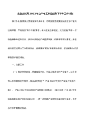 农业农村局2022年上半年工作总结和下半年工作计划2022年,我局深入贯彻落实中央和省、市巩固脱贫成果接续推进乡村振兴决策部署,严格落实“四个不摘”要求,保持政策总体稳定。大力实施“四带一自”特色种养业提升行动,推动全县特色产业提质增效;积极争取帮扶事项,推进省市直定点帮扶工作取得实效;持续落实“双包”各项帮扶举措,促进村集体经济和包保户稳定增收。一、主要工作(一)制定完善政策,明确发展方向。为深入推进乡村产业振兴,结合省市工作部署和文件精神,我县及时制定了《*县2022年乡村产业振兴实施方案》、《*县2022年农业特色产业帮扶工作要点》;修订完善《*县2022年特色种养业到户奖补实施办法》,...