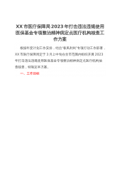 XX市医疗保障局2023年打击违法违规使用医保基金专项整治精神病定点医疗机构核查工作方案根据年度计划工作安排,结合“春风利剑”专项行动工作部署,XX市医疗保障局定于3月上中旬在全市范围内组织开展2023年打击违法违规使用医保基金专项整治精神病定点医疗机构抽查核查,特制定本方案。一、工作目标坚持全覆盖与突出重点并重、预防与查处并重、行业自律与专项整治并重原则。结合医保基金监管安全规范年行动,向违反协议行为亮剑;以精神病定点医疗机构违规诊疗为重点,聚焦基层专科定点医疗机构、社会办专科定点医疗机构及二级以上综合性定点医疗机构下设精神科,在前期精神病定点医疗机构全覆盖自查自纠的基础上,拓展专项整治的广...