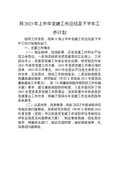 某公司2023年上半年党建工作总结及下半年工作计划2023年上半年,在公司党委的坚强领导下,党建工作部紧紧围绕x局党委和公司党委年度工作布局,强化政治功能、发挥引领服务作用,结合职能职责统筹推进公司党群建设,有力服务公司高质量发展。一、2023年重点工作开展情况(一)坚持悟思想,突出理论研学坚定不移贯彻落实党的二十大精神,印发学习宣传贯彻党的二十大精神实施方案,并督促落实,按月形成学习宣传贯彻党的“二十大”精神督导工作台账,各基层党支部、公司领导讲授专题党课50余次;以“领导领学+个人自学”方式围绕党的二十大精神进行专题学习研讨,深入学习了习近平总书记系列重要讲话精神和党的二十大精神;坚持以习...
