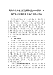 聚力产业升级激活发展动能——关于XX县工业经济高质量发展的调查与思考习近平总书记指出“新时代新征程,以中国式现代化全面推进强国建设、民族复兴伟业,实现新型工业化是关键任务。”近年来,XX县完整、准确、全面贯彻新发展理念,坚持稳中求进工作总基调,持续深入推进“三个年”活动。紧紧围绕“四提攻坚战”重点任务,聚力推动工业经济提质增效。为全面激活XX工业经济高质量发展动能,了解其存在的困难短板,精准建言献策,近期,县政协成立专题调研组,通过实地查看、座谈交流等多种方式,对全县工业经济高质量发展情况进行了专题调研,形成调研报告,供参考。一、现状和成效近年来,XX县始终把工业经济高质量发展摆在突出位置,围...