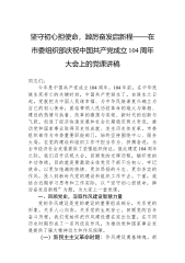 坚守初心担使命,踔厉奋发启新程——在市委组织部庆祝中国共产党成立104周年大会上的党课讲稿同志们:今年是中国共产党成立104周年。104年前,在中华民族生死存亡的关键时刻,中国共产党诞生了。自诞生之日起,党就把为中国人民谋幸福、为中华民族谋复兴确立为自己的初心使命,团结带领人民历经革命的炮火与烽烟、建设的热情与执着、改革的激荡与突破、新时代的创新与飞跃,创造了经济快速发展和社会长期稳定两大奇迹,推动党和国家事业取得历史性成就、发生历史性变革。市委组织部作为市委重要职能部门,始终坚持围绕中心、服务大局,在党的建设和组织工作中担当作为、拼搏奋进,为全市经济社会发展提供了坚强组织保证。值此建党104...