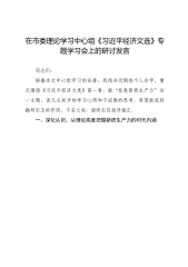 市委中心组学习《习近平经济文选》研讨发言 大家好。根据会议安排,我就学习《习近平经济文选》第一卷作个研讨发言。这次学习对我而言,是一次深刻的理论滋养和思想洗礼。文选中的一系列重要文稿,系统记录了新时代我国经济社会发展的壮阔历程和辉煌成就,更蕴含着指导我们未来发展的科学方法论。我的认识还很初步,借此机会,结合个人的一些思考,谈三点不成熟的心得体会,主要是向各位领导和同志们汇报学习过程中的一些感悟和反思,希望能得到大家的批评指正。一、在深学细悟中,校准高质量发展的“政绩观”过去很长一段时间,一谈到发展,我的第一反应可能还是速度、规模和总量。但通过反复研读《习近平经济文选》,我深刻体会到,习近平总书...