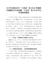 XX市文明办关于“十四五”和2025年精神文明建设工作总结暨“十五五”和2026年工作安排的报告“十四五”时期,是我市全面深化改革、推动高质量发展的关键五年。站在2025年岁末,我们即将完成“十四五”规划的各项目标任务,开启“十五五”发展新征程。市文明办坚持以习近平新时代中国特色社会主义思想为指导,紧紧围绕举旗帜、聚民心、育新人、兴文化、展形象的使命任务,聚焦文明培育、文明实践、文明创建,扎实推进精神文明建设各项工作,为全市经济社会高质量发展提供了坚强思想保证和强大精神动力。本报告系统总结“十四五”时期及2025年精神文明建设工作,科学谋划“十五五”时期及2026年的发展蓝图。一、“十四五”时...