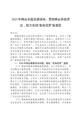 2025年两会专题党课讲稿:贯彻两会养老理念,助力实现“老有优养”新愿景同志们:随着我国社会经济的发展和人口结构的变化,老年人口数量持续增长,老龄化程度不断加深。据统计,我国老年人口已突破3亿人,养老问题日益成为社会关注的焦点。从“老有所养”迈向“老有优养”,不仅是老年人对美好生活的向往,更是社会发展的必然趋势。2025年全国两会高度关注养老问题,在养老服务体系建设、养老金制度完善、医养结合推进等多方面进行了深入探讨和政策部署。作为党员,我们要深刻领会两会精神,积极行动起来,为推动养老服务优化,实现“老有优养”新愿景贡献力量。一、2025年两会聚焦养老问题,描绘“老有优养”蓝图(一)两会对养老...
