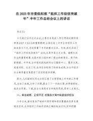 在2025年市委组织部“组织工作创优突破年”半年工作总结会议上的讲话同志们:今天我们召开这次会议,主要任务是深入学习贯彻近期市委常委会(扩大)会议的重要精神,全面总结上半年全市组织工作的成效与不足,系统部署下半年的重点任务。年初,我们启动了“组织工作创优突破年”活动,这是市委立足全局、着眼长远作出的重要部署,也是对我们组织部门提出的新要求、寄予的新期望。半年来,全市组织战线的同志们围绕中心、服务大局,锐意进取、扎实工作,各项任务取得了阶段性成果,为全市经济社会高质量发展提供了坚实的组织保障。刚才,几位副部长同志分别汇报了分管领域上半年的工作情况,总结了成绩,分析了问题,提出了下一步的打算,讲得...