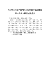 XX市XX区水务局XX同志履行法治建设第一责任人职责述职报告中共XX市XX区委全面依法治区委员会:2022年,在区委依法治区办公室的有力指导下,我始终坚持以习近平新时代中国特色社会主义思想为指导,深入学习宣传贯彻习近平法治思想、中央全面依法治国工作会议精神和党中央、省委、市委、区委关于法治建设系列决策部署,认真履行推进法治建设第一责任人职责,大力推进法治水务建设,为全区经济社会高质量发展提供了坚强的水务法治保障。现将履职情况报告如下。一、推进法治建设第一责任人职责履行情况(一)增强法治素养。我始终坚持从高从严要求自己,切。。实履行法治建设重要组织者、推动者2和实践者的职责。带头强化理论,深入开...