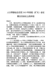 人大常委会主任在2025年党组(扩大)会议暨主任会议上的讲话同志们:今天,我们召开市人大常委会党组(扩大)会议暨主任会议,主要任务是深入学习贯彻党的二十大和二十届二中、三中全会精神,全面落实省委、市委全会部署要求,总结2024年工作,部署2025年任务,动员全市人大系统以“创新提升年”为抓手,奋力开创新时代人大工作新局面。刚才,我们传达学习了中央经济工作会议和省委全会精神,各委室汇报了2025年工作打算。下面,我讲三个方面意见:一、总结成绩、分析形势,切实增强做好新时代人大工作的责任感使命感(一)充分肯定xxxx年市人大常委会工作成效。一年来,在市委的坚强领导下,市人大常委会紧扣全市工作大局,...