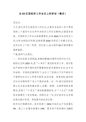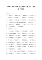 在XX县委经济工作会暨一季度“开门红”工作部署会议上的讲话(精品)同志们:今天,我们召开县委经济工作会暨一季度“开门红”工作部署会议,主要任务是,全面贯彻党的二十大和二十届历次全会精神,深入落实中央、省委、州委经济工作会议的决策部署,以及县委十四届九次全会的具体要求,总结回顾2025年全县经济工作,深刻分析当前面临的经济形势,系统研究部署2026年经济工作的目标任务和重点举措。刚才,会议传达学习了上级经济工作会议精神,通报了2025年全县经济运行情况,相关部门也作了很好的表态发言,态度坚决、措施务实,我完全赞同。下面,我讲几点意见。一、回望来路,在克难奋进中砥砺前行,坚定高质量发展的信心与决心...