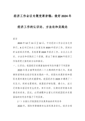 2024年中央经济工作会议学习心得体会研讨发言材料(七篇)与局党组2024年党建工作要点5篇供参考2024年中央经济工作会议学习心得体会研讨发言材料(七篇)第一篇12月11日至12日,中央经济工作会议召开,习近平总书记发表重要讲话,深刻分析当前经济形势,系统部署2024年经济工作。会议强调,明年要围绕推动高质量发展,突出重点,把握关键,扎实做好经济工作。兔去龙来辞旧岁,継往开来展宏图,党员干部要以习近平新时代中国特色社会主义思想为指导,以党中央关于经济工作的决策部署画龙点睛,提振信心、增添动力、防范底线,让中国经济巨龙“一飞冲天”。提振一份信心,涵养市场经济精气神解决问题。会议认为,“要顶住外...