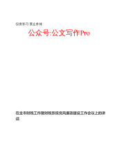 仅供学习禁止外传公众号:公文写作Pro在全市财税工作暨财税系统党风廉政建设工作会议上的讲话公众号:公文写作Pro整理,咨询微信:KingGuKai今天召开全市财税工作会议,主要任务是贯彻省委经济工作会议、全省财政和税收工作会议和市委经济工作会议精神,回顾总结2019年全市财税工作,分析研判存在的问题和面临的形势,研究部署今后一个时期的重点工作任务,动员各级各部门进一步坚定信心、抢抓机遇,创新举措、迎难而上,努力克服新冠肺炎疫情影响千方百计抓增收、保支出,确保完成年初确定的目标任务。今天的会议延伸到乡镇一级,财政税收的工作责任目标和任务一竿子插到底,落实到乡镇一级。自疫情发生以来,党中央、省委省...