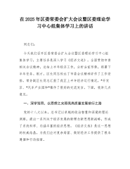 在2025年区委常委会扩大会议暨区委理论学习中心组集体学习上的讲话同志们:今天我们召开区委常委会扩大会议暨区委理论学习中心组集体学习,主要任务是深入学习《经济文选》,全面贯彻市委相关会议精神,总结上半年经济工作,分析当前形势,部署下半年任务。刚才,区长同志传达了市委会议精神并作了工作安排,常务副区长同志汇报了我区上半年经济运行情况,*开发区、*汽车产业园和*镇作了很好的交流发言。下面,我讲几点意见。一、深学笃用,以思想之光照亮高质量发展前行之路党的十八大以来,总书记以卓越的政治智慧和深邃的理论洞察,提出一系列关于经济发展的新理念新思想新战略,形成了系统科学、内涵丰富的经济思想。《经济文选》是这...