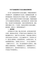 市关于加强基层医疗卫生队伍建设的调研报告为了进一步加强乡村医疗卫生队伍建设,不断提高基层医疗卫生服务水平,加快健康扶贫工作步伐,巩固脱贫攻坚成果,按照市委批转的《市政协2023年工作要点》安排,在专题调研的基础上,召开以“加强全市乡村医疗卫生队伍建设、助推精准脱贫工作”为主题的双月协商座谈会,各县市政协主席、相关部门负责同志、部分医疗卫生界政协委员、乡镇卫生院和村医代表,紧扣协商主题深入讨论,广泛协商,为加快乡村医疗卫生队伍建设,建言献策,知情出力。现将情况报告如下:一、基本现状全市现有123个乡镇。截止2022年底,全市有乡镇卫生院129所,现有床位2391张,平均每千农业人口拥有床位1.3...