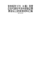 发言系列570(4篇)民营企业代表在平凉市政银企联席会议上的发言材料汇编2021年8月目录1.甘肃省新世纪投资控股集团有限责任公司党委书记、董事长、总经理高兰银发言12.甘肃金江建设集团副总经理李晓霞发言33.平凉市天成药业有限责任公司董事长王晓静发言44.平凉市江苏商会会长龚健发言5民营企业代表在平凉市政银企联席会议上的发言材料汇编(2021年8月20日)甘肃省新世纪投资控股集团有限责任公司党委书记、董事长、总经理高兰银发言新世纪集团公司是在党的改革开放政策指引下发展起来的民营企业。多年来,新世纪集团公司在不断做大做强企业的同时,积极响应各级党委政府的号召,在城市项目建设、精准扶贫、疫情防控...