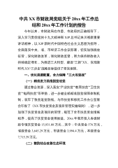 中共XX市财政局党组关于20xx年工作总结和20xx年工作计划的报告今年以来,市财政局在市委、市政府的正确领导下,深入学习贯彻党的十九大精神和XJP总书记来川视察重要讲话精神,以XJP新时代中国特色社会主义思想为指导,全面落实中央、省、市经济工作会议部署,切实加强税收征管,深化财政改革,强化财政监督,努力保持财政收入持续稳定增长,为推进三大转型、建设“三新”XX、实现新时代XX“三步走”战略目标提供了坚实保障。一、优化资源配置,全力保障“三大攻坚战”(一)精准发力助推脱贫攻坚通过整合资源,深入落实“产业扶贫”“教育扶贫”“卫生扶贫”“电商扶贫”等举措,进一步健全精精准脱贫保障体制机制,筑牢了致...