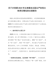 关于乡党委2025年以来落实全面从严治党主体责任情况的自查报告根据上级党委和纪委监委的部署要求,乡党委紧紧围绕新时代党的建设总要求,对照全面从严治党主体责任清单,对2025年以来落实全面从严治党主体责任情况进行了全面自查。现将有关情况报告如下:一、基本情况与主要工作2025年以来,乡党委坚持以新时代中国特色社会主义思想为指导,深入学习贯彻党的二十大和二十届历次全会精神,深刻领悟“两个确立”的决定性意义,增强“四个意识”、坚定“四个自信”、做到“两个维护”,将全面从严治党作为首要政治责任,与中心工作同部署、同落实、同检查、同考核。党委主要负责同志认真履行第一责任人职责,班子成员自觉履行“一岗双责...