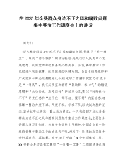 在2025年全县群众身边不正之风和腐败问题集中整治工作调度会上的讲话同志们:深入整治群众身边的不正之风和腐败问题,是捍卫“两个确立”、做到“两个维护”的政治检验,是践行以人民为中心发展思想、巩固党的执政根基的必然要求。当前,集中整治工作已经进入攻坚拔寨、纵深推进的关键时期。全县各级党组织和广大党员干部必须清醒地认识到,这项工作绝非权宜之计,更不是“一阵风”。我们必须坚决摒弃“歇歇脚、松口气”的错误思想和“大功告成、差可应付”的过关心态,要以“时时放心不下”的责任感和“坐不住、等不起、慢不得”的紧迫感,确保集中整治力度不减、尺度不松、标准不降,以决战决胜的姿态,坚决扛牢扛实这一重大政治责任。今天...