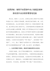 党课讲稿:锲而不舍贯彻中央八项规定精神推动党中央决策部署落地见效同志们,党的十八大以来,以*同志为核心的党中央以制定和落实中央八项规定开局破题,推动党风政风焕然一新、社风民风持续向好。在全党开展深入贯彻中央八项规定精神学习教育,是以*同志为核心的党中央,从党和国家事业发展战略全局出发作出的重大决策部署。要深入学习贯彻*总书记关于加强党的作风建设的重要论述,深刻认识开展学习教育对全面加强新时代党的建设、推动全面从严治党向纵深发展、巩固党长期执政基础和推进中国式现代化建设的重大意义,锲而不舍抓好贯彻落实,以实际行动忠诚捍卫“两个确立”、坚决做到“两个维护”。今天,我以“锲而不舍贯彻中央八项规定精神...
