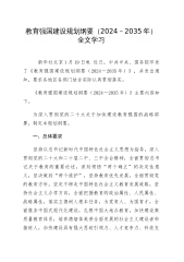 教育强国建设规划纲要(2024-2035年)全文学习 新华社北京1月19日电近日,中共中央、国务院印发了《教育强国建设规划纲要(2024-2035年)》,并发出通知,要求各地区各部门结合实际认真贯彻落实。《教育强国建设规划纲要(2024-2035年)》主要内容如下。为深入贯彻党的二十大关于加快建设教育强国的战略部署,制定本规划纲要。 一、总体要求 坚持以总书记新时代中国特色社会主义思想为指导,深入贯彻党的二十大和二十届二中、三中全会精神,全面贯彻总书记关于教育的重要论述,深刻领悟“两个确立”的决定性意义,坚决做到“两个维护”,坚持教育优先发展,全面贯彻党的教育方针,坚定不移走中国特色社会主...