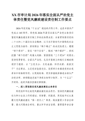 XX市审计局2026年落实全面从严治党主体责任暨党风廉政建设责任制工作要点2026年是实施“十五五”规划的开局之年,也是中国共产党成立105周年。局党组2026年落实全面从严治党主体责任暨党风廉政建设责任制工作的总体要求是:全面贯彻落实党的二十大和二十届历次全会精神,以习近平新时代中国特色社会主义思想为指导,深刻领会“两个确立”的决定性意义,增强“四个意识”、坚定“四个自信”、做到“两个维护”,深刻把握“两个仍然”的重大判断,紧紧围绕“三个更加”的要求,坚持党要管党、全面从严治党,扎实开展树立和践行正确政绩观学习教育,以“立党为公、为民造福、科学决策、真抓实干”为总要求,立足经济监督定位,发挥...