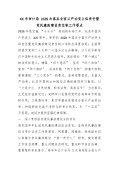XX公司纪委2026年党风廉政建设和反腐败工作计划(精品)2026年是实施“十五五”规划的开局之年,也是我们党成立105周年,做好党风廉政建设和反腐败工作意义重大、责任重大。为深入推进公司全面从严治党工作,持续营造风清气正的政治生态和干事创业的良好环境,结合公司实际,特制定本年度工作计划。一、总体要求坚持以习近平新时代中国特色社会主义思想为指导,全面贯彻落实党的二十大和二十届历次全会精神,深刻领会和把握习近平总书记关于党的自我革命的重要思想,坚定拥护“两个确立”、坚决做到“两个维护”。紧紧围绕保障公司在“十五五”时期目标任务顺利实现这一核心,以强化政治监督为统领,以巩固拓展深入贯彻中央八项规定...
