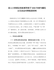 县人大常委会党组领导班子2025年度专题民主生活会对照检查材料根据县委关于召开2025年度民主生活会的工作部署,县人大常委会党组班子紧紧围绕会议主题,深入学习贯彻习近平新时代中国特色社会主义思想,全面落实党的二十届四中全会精神,广泛征求各方意见,深入开展谈心谈话,严格对照“五个带头”重要要求,深入查找问题、剖析根源并明确今后努力方向与整改措施。现将对照检查情况报告如下。一、存在的主要问题(一)在带头强化政治忠诚、提高政治能力方面。班子始终把政治建设摆在突出位置,深刻领悟“两个确立”的决定性意义,不断增强“四个意识”、坚定“四个自信”、做到“两个维护”,但对照更高标准仍有差距。一是政治领悟的深度...