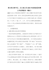 综合党支部书记、办公室主任2025年度抓基层党建工作述职报告(精品)2025年,在公司党委的正确领导下,我认真履行党支部书记抓基层党建工作第一责任人职责,团结带领支部全体党员,坚持以习近平新时代中国特色社会主义思想为指导,深入贯彻党的二十大和二十届二中、三中、四中全会精神,紧紧围绕公司中心工作,扎实推进支部党建各项任务落实。现将有关情况报告如下:一、主要履职情况(一)强化理论武装,筑牢思想根基一是深学细悟创新理论。坚持把学习贯彻习近平新时代中国特色社会主义思想作为首要政治任务,特别是深入学习习近平总书记关于党的建设的重要思想、关于党的自我革命的重要思想,引导支部党员深刻领悟“两个确立”的决定性...