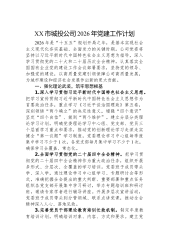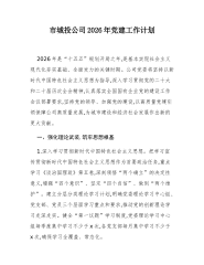 市城投公司2026年党建工作计划2026年是“十五五”规划开局之年,是基本实现社会主义现代化夯实基础、全面发力的关键时期。公司党委将坚持以新时代中国特色社会主义思想为指导,深入学习贯彻党的二十大和二十届历次全会精神,认真落实全国国有企业党的建设工作会议部署要求,坚持党的领导、加强党的建设,以高质量党建引领保障公司高质量发展,为城市建设和经济社会发展作出新的更大贡献。一、强化理论武装,筑牢思想根基1.深入学习贯彻新时代中国特色社会主义思想。把学习宣传贯彻新时代中国特色社会主义思想作为首要政治任务,重点学习《谈治国理政》第五卷,深刻领悟“两个确立”的决定性意义,增强“四个意识”、坚定“四个自信”、...