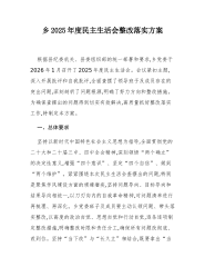 乡2025年度民主生活会整改落实方案根据县纪委机关、县委组织部的统一部署和要求,乡党委于2026年1月召开了2025年度民主生活会。会议紧扣主题,深入开展批评和自我批评,全面查摆了领导班子及成员存在的突出问题,深刻剖析了问题根源,明确了努力方向和整改措施。为确保查摆出的问题得到切实有效解决,高质量抓好整改落实工作,特制定本方案。一、总体要求坚持以新时代中国特色社会主义思想为指导,全面贯彻党的二十大和二十届三中、四中全会精神,深刻领悟“两个确立”的决定性意义,增强“四个意识”、坚定“四个自信”、做到“两个维护”。紧紧围绕本次民主生活会查摆出的问题,特别是聚焦作风建设方面的顽瘴痼疾,坚持问题导向、...