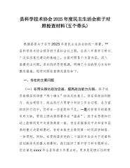 XX县工商业联合会领导班子2025年度民主生活会对照检查材料(五个带头)根据县委关于召开2025年度民主生活会的统一部署,XX县工商业联合会领导班子紧扣会议主题,在深入开展学习研讨、广泛征求意见建议、坦诚进行谈心谈话的基础上,全面总结贯彻落实中央八项规定精神情况,对照5个方面内容,深入查摆了存在的突出问题,深刻剖析了问题产生的根源,并明确了下一步的整改方向和措施。现将对照检查情况报告如下。一、存在的主要问题(一)在带头强化政治忠诚、提高政治能力方面。班子能够深刻领悟“两个确立”的决定性意义,但在将政治判断力、政治领悟力、政治执行力贯穿于服务“两个健康”全过程的实践中,仍存在一些差距和不足。一是...