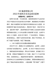 XX集团有限公司2022年度民主生活会发言提纲党委副书记、总经理XX按照中央纪委、中央组织部、国资委党委关于认真开好2022年度民主生活会的有关文件精神,根据集团公司党委的要求,我以“全面贯彻习近平新时代中国特色社会主义思想,深刻领悟‘两个确立’的决定性意义,增强‘四个意识’、坚定‘四个自信’、做到‘两个维护’,团结带领党员干部职工以奋发有为的精神贯彻落实党的二十大作出的重大决策部署”为主题,认真学习党的二十大精神,在深入学习研讨、广泛征求意见、开展谈心谈话的基础上,查摆了自身存在的问题,报告了有关情况,剖析了问题产生的根源,制定了整改措施。一、2021年度民主生活会整改措施完成情况2022年...