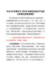 中共xx区委关于2022年落实全面从严治党主体责任的情况报告