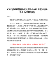 XX市委组织部机关党支部在2022年度组织生活会上的述职报告同志们:现在我代表支部委员会向大会述职,不当之处,敬请批评指正。2022年,中共XXX市委组织部支部委员会在市直属机关工委的坚强领导下,坚持以XJP新时代中国特色社会主义思想为指导,深入贯彻落实党的XX大精神、XJP总书记视察XX重要讲话精神,全面贯彻落实新时代党的建设总要求和新时代党的组织路线,衷心拥护“两个确立”,忠诚践行“两个维护”,严格落实机关党建各项工作任务,不折不扣落实党要管党、全面从严治党要求,切实增强组织部支部党组织的凝聚力和战斗力,强化党支部政治功能,充分发挥党支部战斗堡垒作用。一、强化政治建设,坚定政治方向,忠诚践...