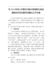 市2024年深入开展乡村振兴领域群众身边腐败和作风问题专项整治工作方案为切实开展好我市乡村振兴领域群众身边腐败和作风问题专项整治工作,按照市纪委监委关于印发《2024年深入开展群众身边腐败和作风问题专项整治工作方案》的通知要求,结合我市乡村振兴领域工作实际,现制定实施方案如下。一、目标任务以习近平新时代中国特色社会主义思想为指导,深入贯彻党的二十大精神,认真落实中省市纪委全会、市委十七届六次全会和市纪委相关会议部署要求,深刻领悟“两个确立”的决定性意义,增强“四个意识”,坚定“四个自信”,做到“两个维护”。持续深化拓展“三个年”活动等中心工作为抓手,突出问题导向,聚焦群众关心关注,以“小切口、...