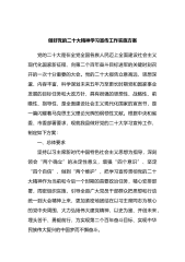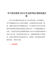 学习宣传贯彻2023年全国“两会”精神实施方案2023年全国两会是党的XX大后召开的第一次全国两会,对于全面建设社会主义现代化国家、走好新的赶考之路统一思想、凝聚力量具有非常重要的意义,学习贯彻习近平总书记重要讲话精神和全国两会精神是当前和今后一个时期的重要政治任务。为加强为切实加强刚刚闭幕的2023年全国两会精神学习宣传工作力度,切实谋划好各项工作,积极探索创新工作新模式,创造出更多务实有效的新方法、新举措,将全国两会精神落到实处,制定本方案。一、指导思想坚持以习近平新时代中国特色社会主义思想为指导,把学习宣传贯彻全国两会精神作为当前一项重要政治任务抓紧抓好,深刻领悟“两个确立”的决定性意义...