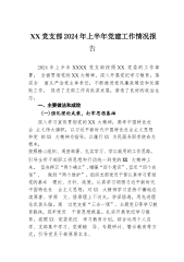 XX党支部2024年上半年党建工作情况报告2024年上半年XXXX党支部按照XX党委的工作部署,全面贯彻党的XX大精神,深入开展党纪学习教育,落实全面从严治党主体责任,不断推进党风廉政建设和反腐败工作,促进了支部工作向纵深发展,营造了良好的政治生态。一、主要做法和成效(一)强化理论武装,打牢思想基础深入学习宣传贯彻党的XX大精神,高举中国特色社会主义伟大旗帜,以习近平新时代中国特色社会主义思想和党的XX大精神为指导,以履行XX为民服务职责使命为根本,按照精心组织、周密部署、扎实学习、学以致用的工作思路,引导全所干部职工将思想和行动统一到党的XX大精神上来,坚决捍卫“两个确立”,增强“四个意识”...