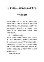 党支部2022-2023年度组织生活会普通党员个人发言提纲本人认真落实集中学习、个人自学、研讨交流等规定动作,在学思践悟中进一步增强了砥砺初心使命、昂扬奋斗精神的责任感和紧迫感。同时,围绕组织生活会主题和“六个方面”对照检查重点,通过谈心交心、集中查摆以及个人自评和党员互评,进行了深入的对照检查、党性分析。现将相关情况汇报如下:一、上一年度相关整改落实情况在上一年度的党史学习教育专题民主生活会上,通过自己找、上级点、互相帮等方式,深入查摆个人存在的突出问题。对查摆出来的带头深刻感悟“两个确立”的决定性意义、带头践行以人民为中心的发展思想、不折不扣贯彻落实党中央、X委和XX委决策部署等XX个方面...