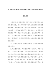 X区委关于2025年上半年落实全面从严治党主体责任的情况报告今年以来,X区委坚持以习近平新时代中国特色社会主义思想为指导,深入学习贯彻习近平总书记视察天津重要讲话精神,贯彻落实党的二十届三中全会精神,在市委的正确领导下,提高政治判断力、政治领悟力、政治执行力深刻领悟“两个确立”的决定性意义、坚决做到“两个维护”,切实履行全面从严治党主体责任,以党的建设全面进步、全面过硬,为建设经济强区、打造品质之城提供坚强政治保证。一、坚持政治引领,持续加压推动,全力凝聚团结奋斗强大合力1.突出思想引领。严格落实“第一议题”、“第一主题”、“第一主课”制度,召开区委常委会会议,跟进传达学习习近平总书记重要讲话...