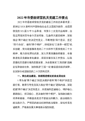 2022年县政府党组党建工作要点2022年县政府党组党建工作的总体要求是:坚持以XJP新时代中国特色社会主义思想为指导,全面贯彻党的十九大和十九届历次全会精神,深入落实XJP总书记关于加强机关党建工作重要论述,大力弘扬伟大建党精神,按照新时代党的建设总要求,认真贯彻党中央决策部署和省市县委工作要求,以党的政治建设为统领,以建章立制为基础,以规范提升为抓手,突出抓好党的政治建设、思想建设、组织建设、作风建设、纪律建设和党风廉政建设,以高质量党建引领高质量发展,以优异成绩迎接党的二十大胜利召开。一、聚焦“两个确立”,全面加强党的政治建设1.旗帜鲜明讲政治。认真贯彻《中共中央关于加强党的政治建设的意...