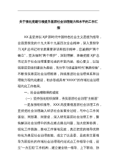 关于强化党建引领提升基层社会治理能力和水平的工作汇报XX县坚持以XJP新时代中国特色社会主义思想为指导,全面贯彻党的十九大和十九届历次全会精神,深入贯彻学习XJP总书记对甘肃重要讲话和指示精神,忠诚拥护”两个确立”,坚决做到”两个维护”,深刻理解、准确把握XJP总书记关于社会治理重要论述的丰富内涵、核心要义,以加强基层党组织建设为基础,充分学习借鉴新时代”枫桥经验”,不断夯实基层社会治理根基,持续推进社会治理体系和治理能力现代化建设,初步形成具有”XXXX”的市域社会治理现代化工作格局。一、社会治理取得的成效(一)坚持强化组织保障,夯实基层社会治理”主根基”一是加强组织领导。XXX高度重视基层...
