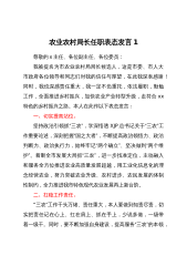 农业农村局长任职表态发言1尊敬的x主任、各位副主任、各位委员:我被提名为市农业农村局局长候选人,这是市委、市人大市政府各位领导和同志们对我的信任与厚望,在此我深表感谢!同时,我也深感责任重大,我一定不负重托,依法履职,勤勉工作,全面推进乡村振兴,加快农业产业转型升级,走符合xx特色的乡村振兴之路。本人在此作以下表态发言:一、切实提高站位。坚持政治引领抓“三农”,学深悟透XJP总书记关于“三农”工作重要论述,深刻把握“国之大者”,不断提高政治领悟力、政治判断力、政治执行力,始终牢记“两个确立”、坚决做到“两个维护”。着眼全市发展大局抓“三农”,进一步找准定位,主动融入和服务全方位推进农业高质量发...
