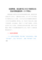 区委常委、政法委书记2022年度民主生活会对照检查材料(六个带头)根据2022年度民生生活会的具体部署和安排,我始终坚持以理论学习为导向,以整改落实为根本,深入学习习近平新时代中国特色社会主义思想、习近平总书记系列重要讲话精神及《习近平谈治国理政》第四卷,进一步坚定了政治立场,锤炼了党性修养。在此基础上,聚焦“六个方面”的要求,从思想、生活和工作几个层面,认真查找自身存在的问题,剖析产生的根源,明确了今后的整改措施和努力方向,现将个人对照检查情况报告如下:一、存在的主要问题(一)在带头深刻感悟两个确立的决定性意义,增强“”四个意识、坚定四个自信、做到两个维护方面。“”“”“”一是理论学习抓的不...