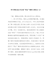 全国两会精神学习心得体会(3)2024年全国两会的胜利召开,如同一盏明亮的灯塔,照亮了国家发展的壮丽征程;如同一股温暖的春风,吹拂着神州大地的蓬勃生机;如同一剂强劲的强心针,激发了全国人民的斗志昂扬。在深入学习两会精神的过程中,我深切感受到责任的重大和使命的光荣。两会精神是坚定的信念,是催人奋进的呼唤。在两会的舞台上,代表委员们肩负人民的重托,共商国是,为国家的发展提出建议。他们的议案和提案,蕴含着智慧和力量,展示了对人民的深厚情感。从经济发展的宏伟蓝图到民生改善的切实举措,从科技创新的前沿探索到环境保护的坚定决心,从教育医疗的优质保障到社会保障的坚实支撑,每一个议题都紧密关联着国家的未来和人...