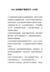 乡村振兴类排比句40例(2022年8月)1.产业振兴是乡村振兴的关键前提,人才振兴是乡村振兴的活力支撑,文化振兴是乡村振兴的灵魂底色,生态振兴是乡村振兴的底线基础,组织振兴是乡村振兴的根本保障。2.做“响”红色旅游,做“靓"旅游廊道,做"深”文旅融合,做"大"体育旅游,做“精"旅游线路,做"优"乡村旅游,做"强”康养旅游,做“旺”新业态游。3.科技协同创新,产业协同发展,空间协同带动,生态协同保护,改革开放协同推进,要素协同支撑,民生协同改善,社会协同治理。4.强化基础设施“硬联通”,增强产业发展“协同性”,提升红色品牌“影响力”,筑牢绿色生态"大屏障”,提升公共服务“普惠度”。5.做"精"工...
