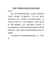 某县干部离岗考察培训班讲话稿同志们:县第一期干部离岗考察培训班,经过两个月紧张的学习教育、培训实践,今天就要结业了。两个月来,通过各级各界的关心关怀、支持帮助,经过大家的不懈努力,培训班完成了教学计划,达到了预期目的,取得了良好效果,获得了圆满成功。在此,我代表县委,对培训班、对学员们顺利完成学习培训任务表示热烈的祝贺!向为本期培训班的组织、教学与管理付出辛勤劳动的同志们表示衷心的感谢!今年是我县实行干部离岗考察制度的第一年,对于谁来、怎么来进行首期离岗考察培训,县委是慎重考虑,也是谨慎决策的,能成为首期离岗考察培训班的学员,更充分说明大家各方面素质是过得硬的。两个月的学习培训,时间虽然不长,...