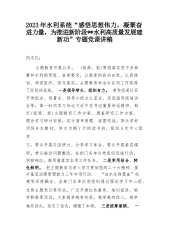 2023年水利系统“感悟思想伟力,凝聚奋进力量,为推进新阶段**水利高质量发展建新功”专题党课讲稿同志们:主题教育开展以来,(我局、委)贯彻落实党中央部署和水利部党组、省委要求,以高度的政治自觉,认真谋划、周密组织、深化落实,主题教育和治水各项工作取得了阶段性成效。一是领导带头、组织有力。委党组通过召开党组会、部署会、领导小组办公室会、巡回指导组培训会等,第一时间学习传达习近平总书记重要讲话精神。制定(我局、委)主题教育工作方案、调查研究工作方案、理论学习研讨安排,实行清单管理、挂图作战。带头学好用好8本教材,举办为期7天的读书班,组织5次中心组学习,带头开展交流研讨、分享学习体会,带头开展基...