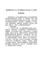 镇党委书记2023年专题民主生活会个人对照检查材料按照镇党委2023年度主题教育专题民主生活的部署和要求,我本着认真负责的态度,按照严、实、细的标准,系统、全面、深入地学习习近平新时代中国特色社会主义思想、习近平总书记系列重要讲话精神等,在此基础上,紧紧围绕“六个方面”的主题,注重学查同步,遍查边改,发现问题,认真分析,剖析根源,明确方向。现将个人对照检查材料报告如下。一、存在的问题(一)理论学习方面。本人能够积极参加专题学习会议、座谈交流、专题培训等,从宏观的角度,认识到增强理论学习的重要性,但学习停留在一般化,大而化之的学习、走马观花的理解、粗枝大叶地分析,蜻蜓点水的应用,致使知识体系和整...