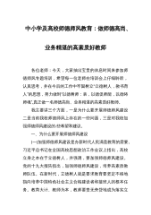 中小学及高校师德师风教育:做师德高尚、业务精湛的高素质好教师 各位老师:今天,大家抽出宝贵的休息时间来参加师德师风专题培训,希望每一位老师在培训会上仔细聆听,认真思考,并在今后的工作中牢固树立“立德树人,教书育人”的思想,努力做到“以德树师:表,以德促师能,以德铸师魂”,真正做一名师德高尚、业务精湛的高素质好教师。 我主要讲三个方面,一是为什么要开展师德师风建设二是当前我校师德师风上存在的一些问题,三是对我校加强师德师风建设的-些希望和建议。 一、为什么要开展师德师风建设 (一)加强师德师风建设是办新时代人民满意教育的需要。习近平总书记在全国高校思想政治工作会议上指出,高校立身之本在于...