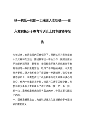 扶一把系一扣助一力端正入党动机——在入党积极分子教育培训班上的专题辅导报告今年以来,在局党组的正确领导下,坚持以学习贯彻党的十九大精神为主线,围绕教学这一中心工作,按照全面从严治党的新部署、新要求,学院扎实开展入党积极分子教育培训等一系列主题活动,取得了非常好的成效。今天受党办委托,就入党积极分子培训作一专题辅导,说实在的辅导谈不上,主要想借这个机会和平台与大家集体谈心与交心,作为一名老党员干部,也是习主席讲关键少数,有责任和义务在入党积极分子成长道路上扶一把,系一扣,助一力,显然也是件光荣而有意义的事,今天主要汇报三个内容。一、思想重视要上去,充分认识这次入党积极分子专题培训的重要意义入党积...